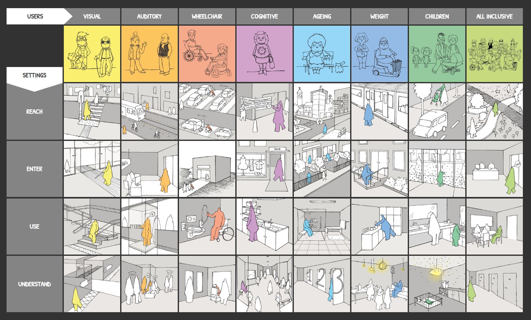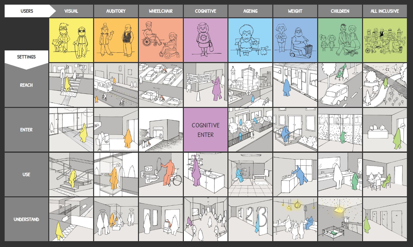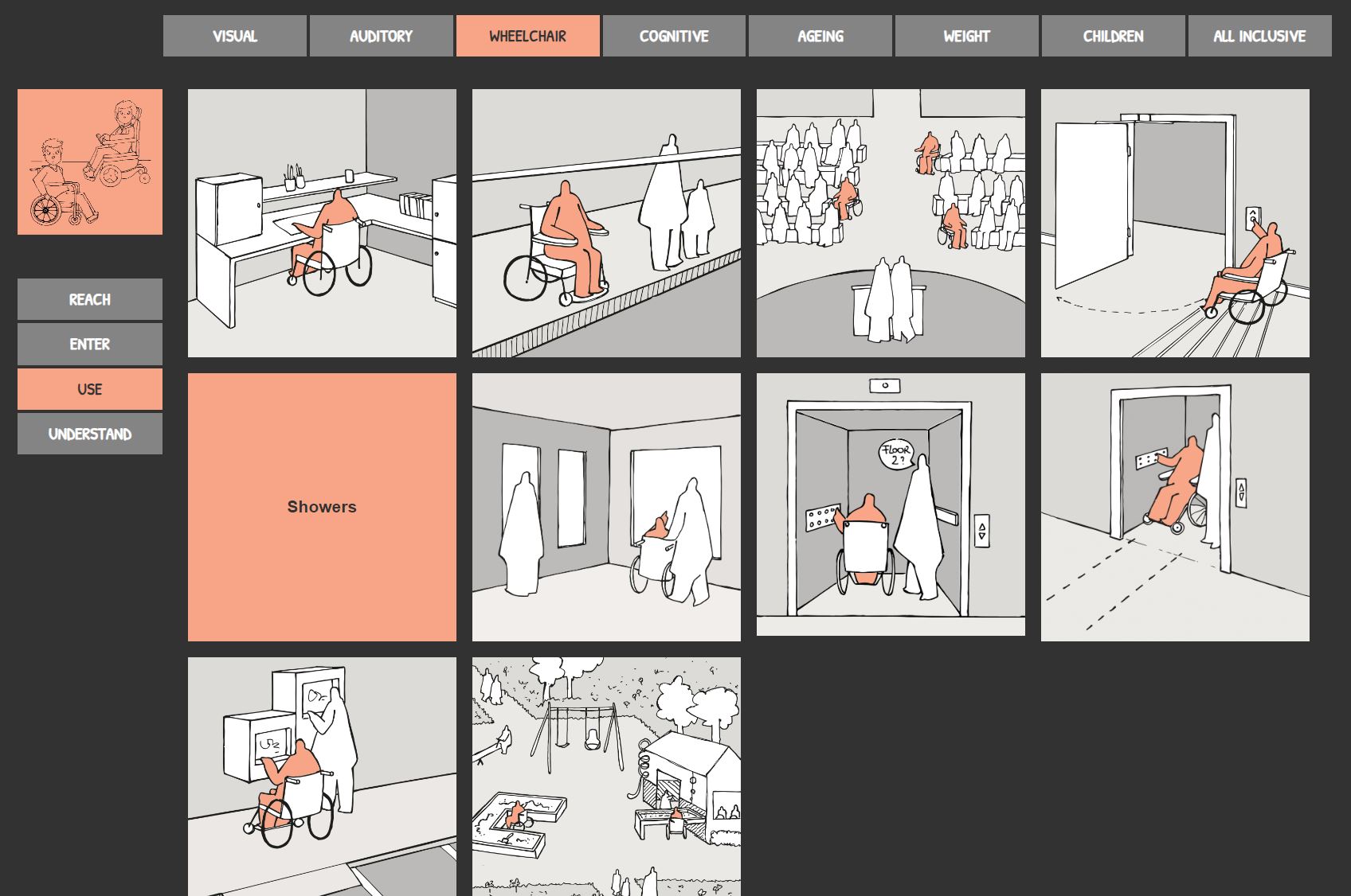 Choose the combination you want to learn more about. For every user you can choose reach, enter, use or understand. Click on them to go to the page with drawings and information.